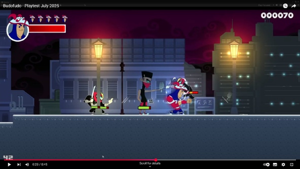 Budofudo is an action platformer currently in early development. This project is nostalgia driven (think Mario Bros. meets Streets of Rage) and is inspired by the traditional animation of games like Street Fighter and Metal Slug. Follow on Itch.io - link
